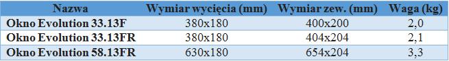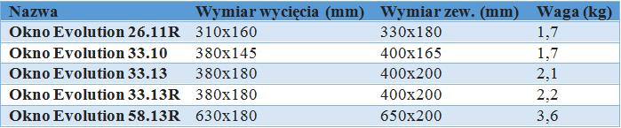 Okna Evolution są wykonane z mocnego aluminiowego odlewu. Szyby są akrylowe i mają grubość 12 mm. Dzięki regulowanemu tarciu szyba pozostaje w pozycji do jakiej została uchylona. Okna te wyposażone są w śruby Parkera i mają wywiercone pasujące do nich otwory. Powierzchnia na której zainstalowane zostanie okno musi być płaska. Dopuszczalne zakrzywienie to 1mm. Symbol R oznacza okna mniej elipsoidalne.